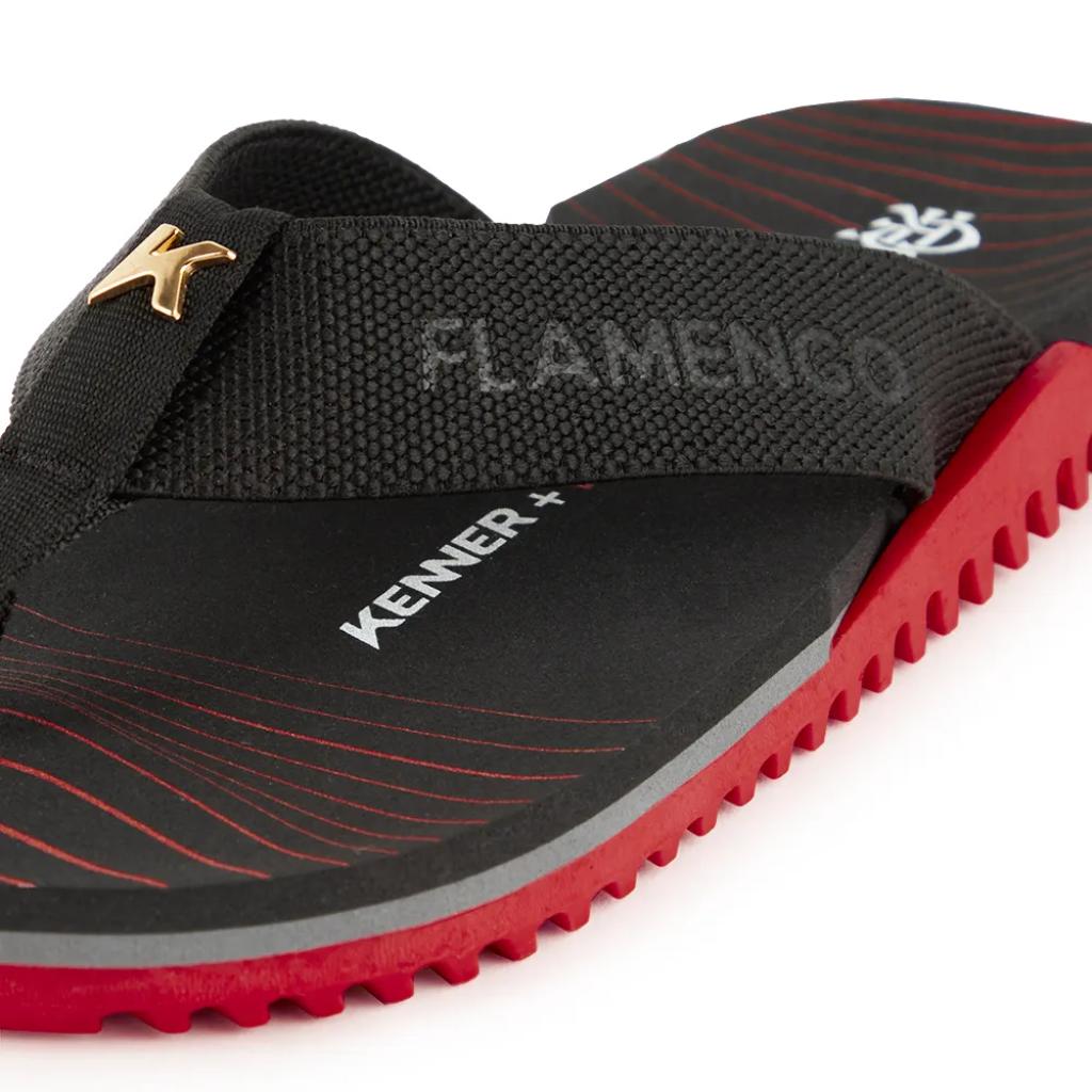 A NK6 leve, flexível e com shape clássico da Kenner em uma versão exclusiva do novo drop em collab com o Flamengo: um K vazado banhado em ouro, o escudo clássico dourado e o nome do Mais Querido em baixo relevo no cabedal.