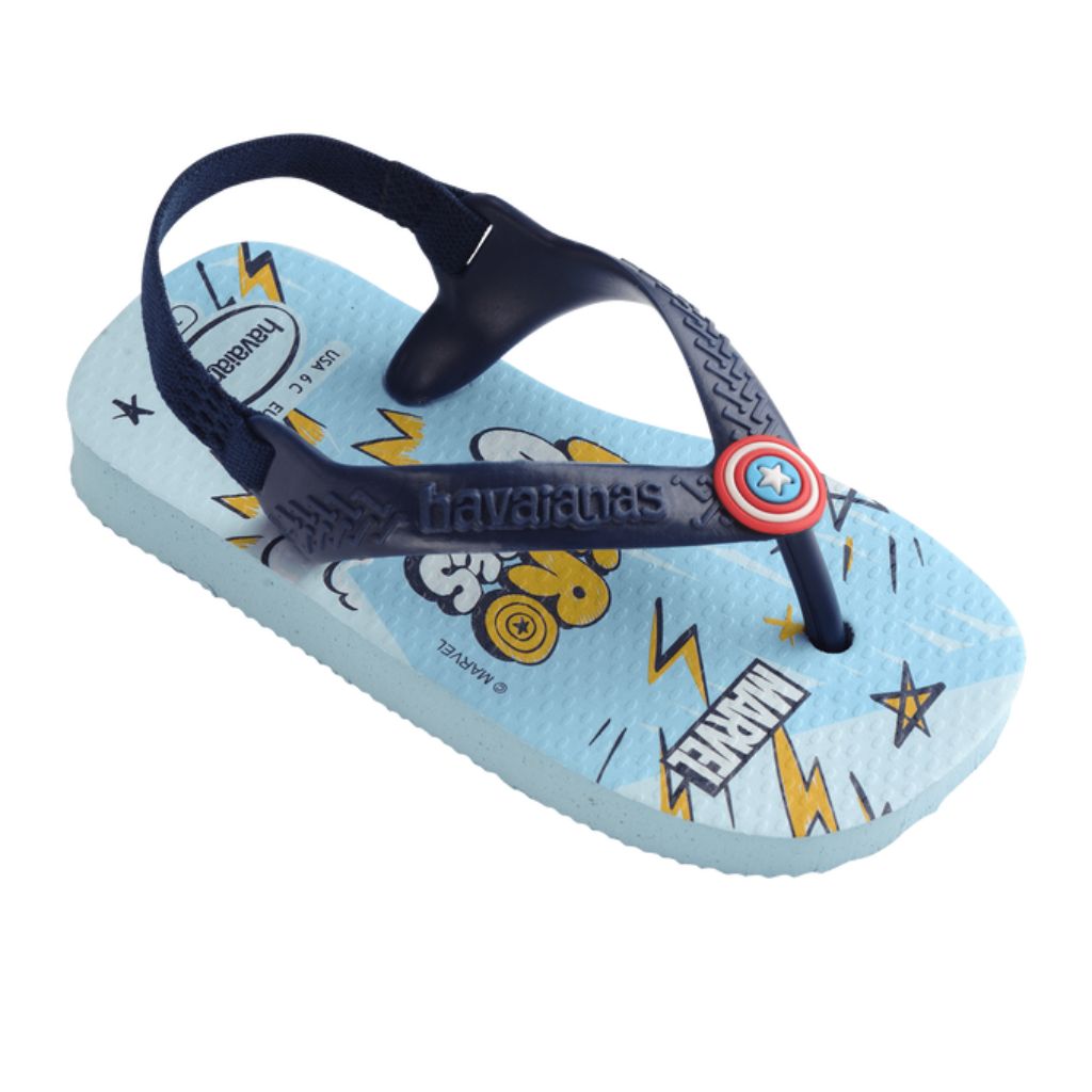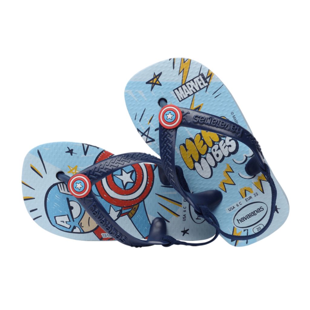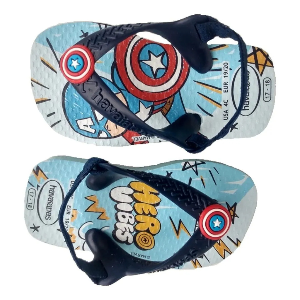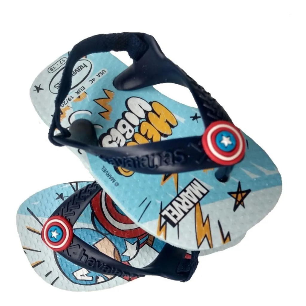 A Havaianas Baby Heróis traz o famoso heróis Capitão América, ainda pequeno em um shape com acessório na tira.