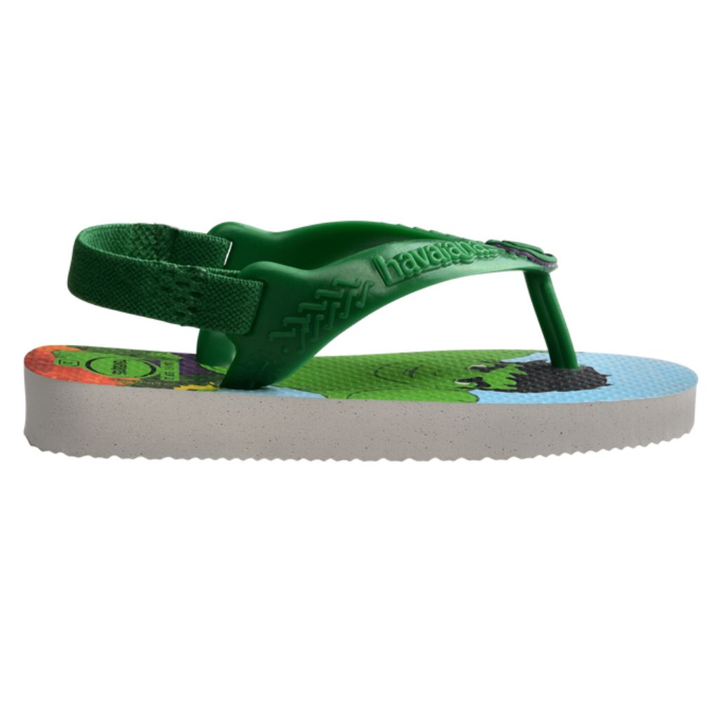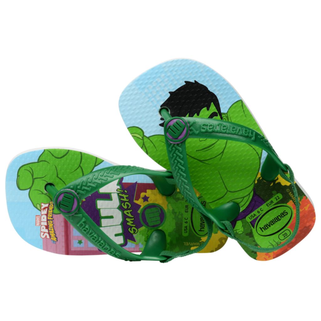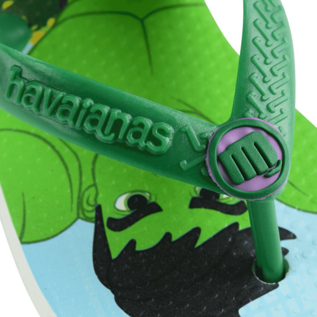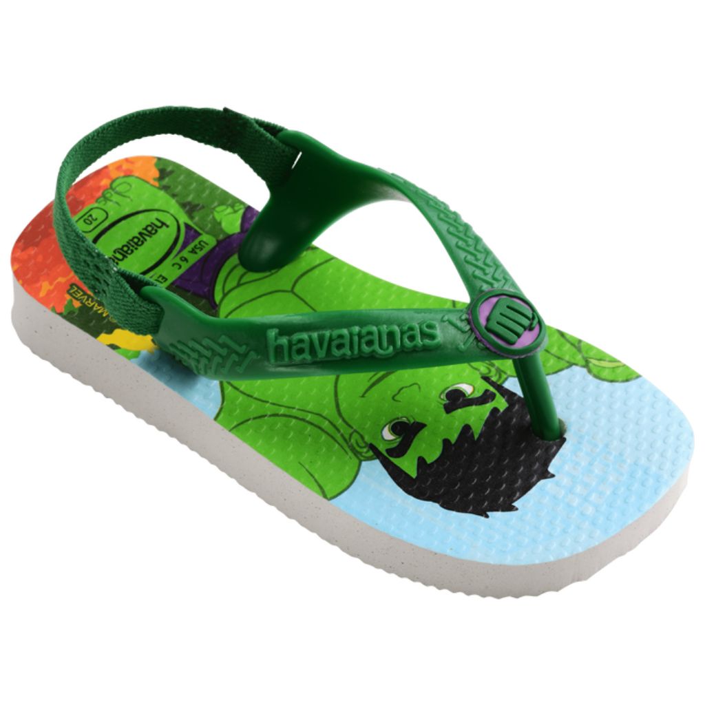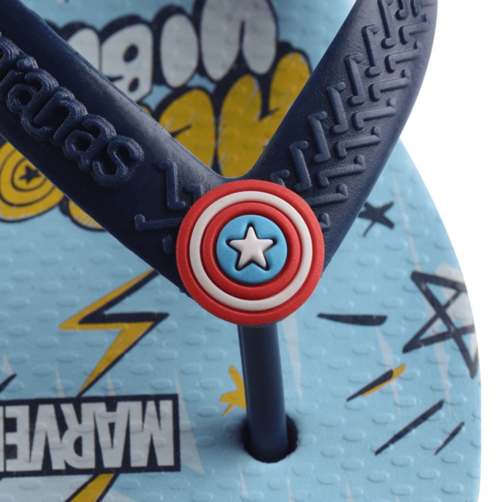 A Havaianas Baby Heróis traz o famoso heróis Capitão América, ainda pequeno em um shape com acessório na tira.