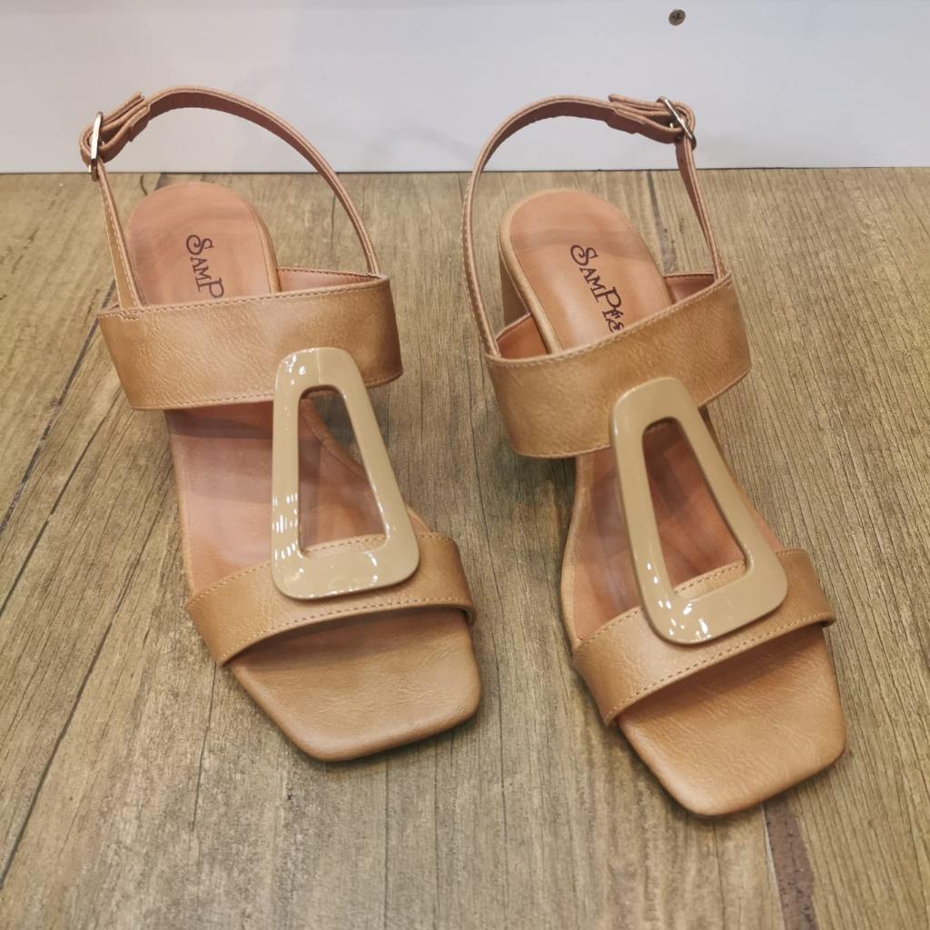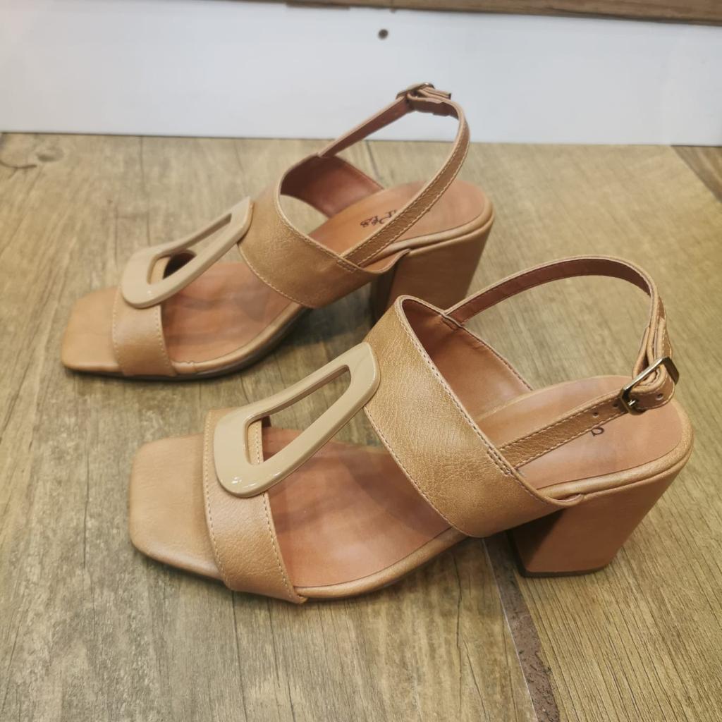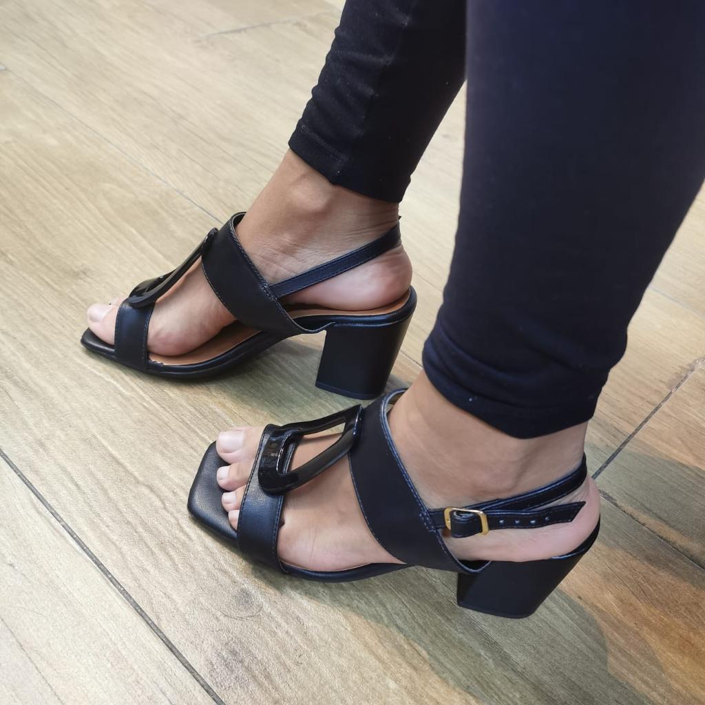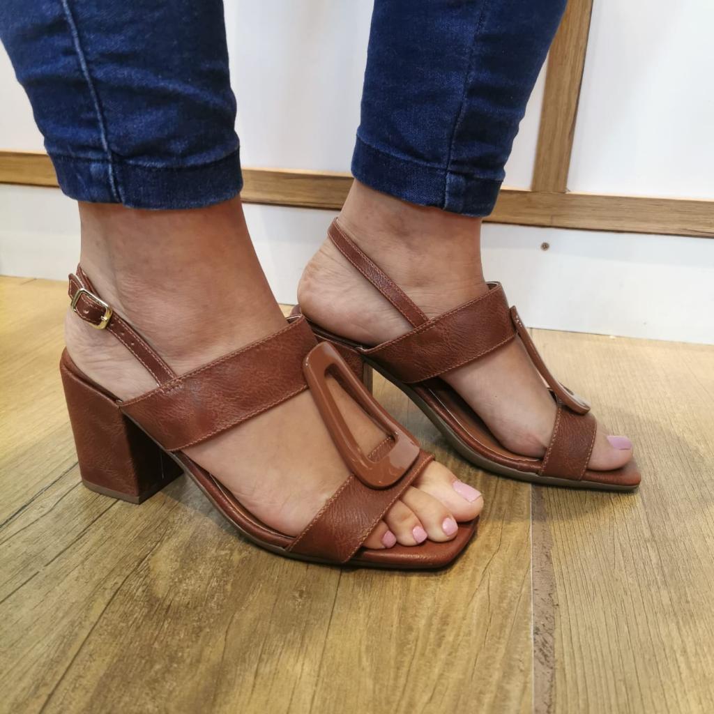 Sandália com salto bloco de 4cm,com duas tiras frontal larga, fechamento com fivela na lateral e aplicação de um triângulo esmaltado no mesmo tom entre as tiras.
