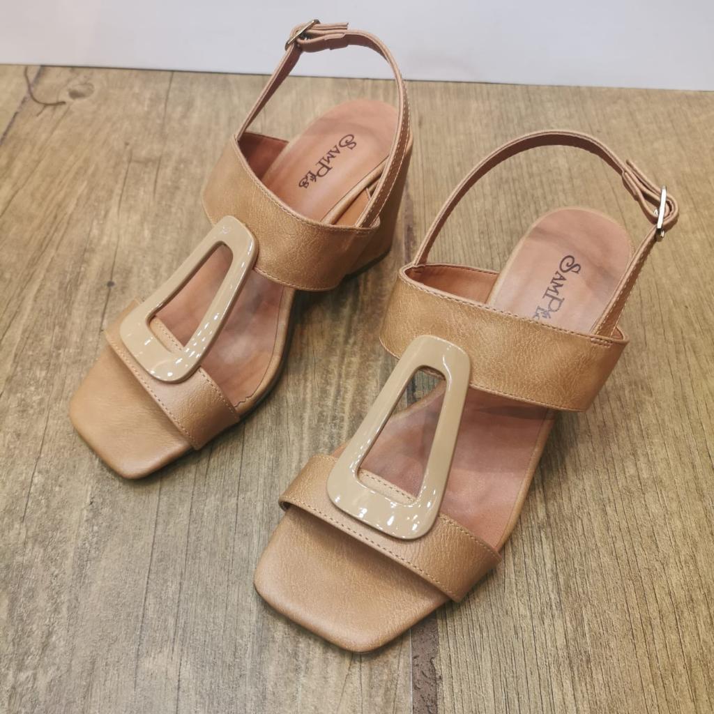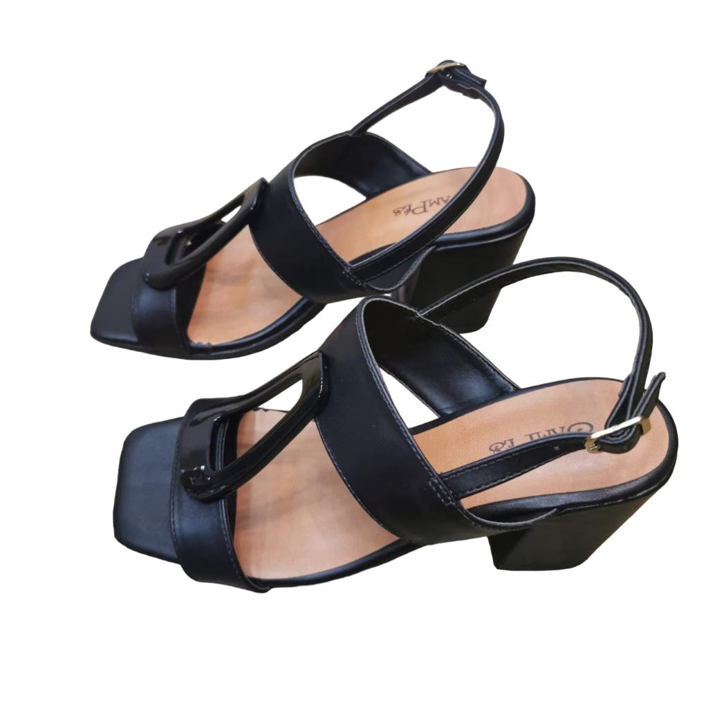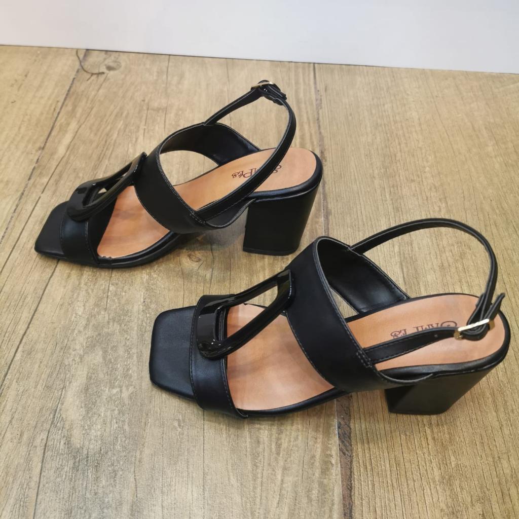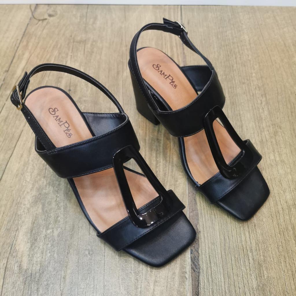 Sandália com salto bloco de 4cm,com duas tiras frontal larga, fechamento com fivela na lateral e aplicação de um triângulo esmaltado no mesmo tom entre as tiras.