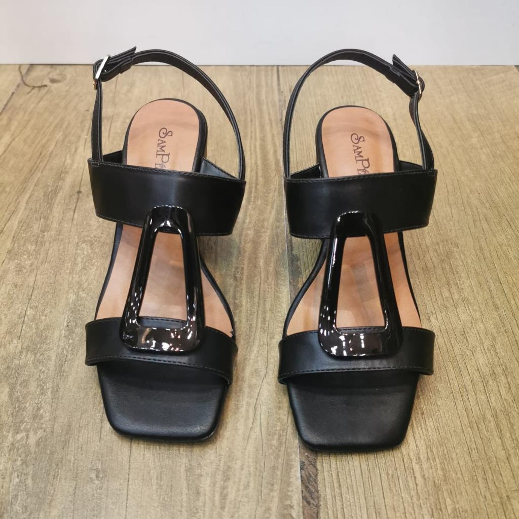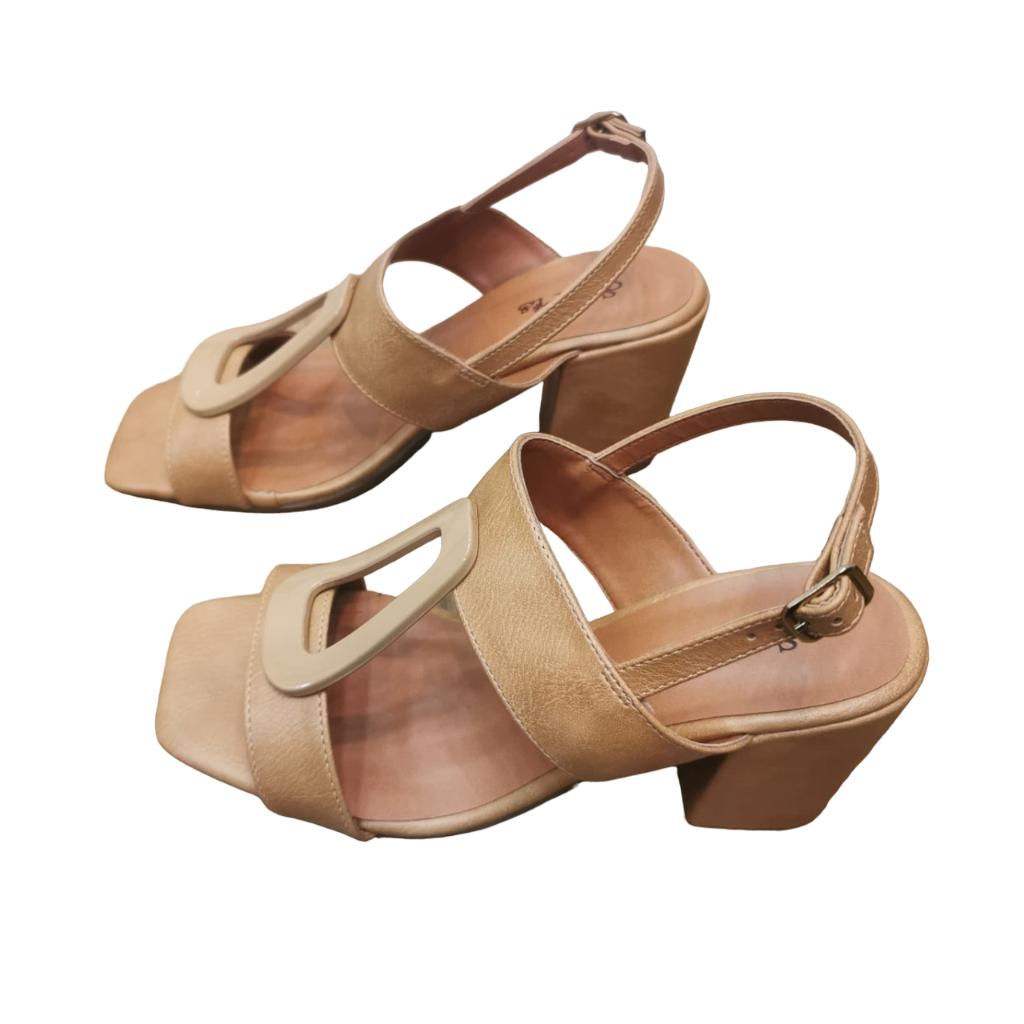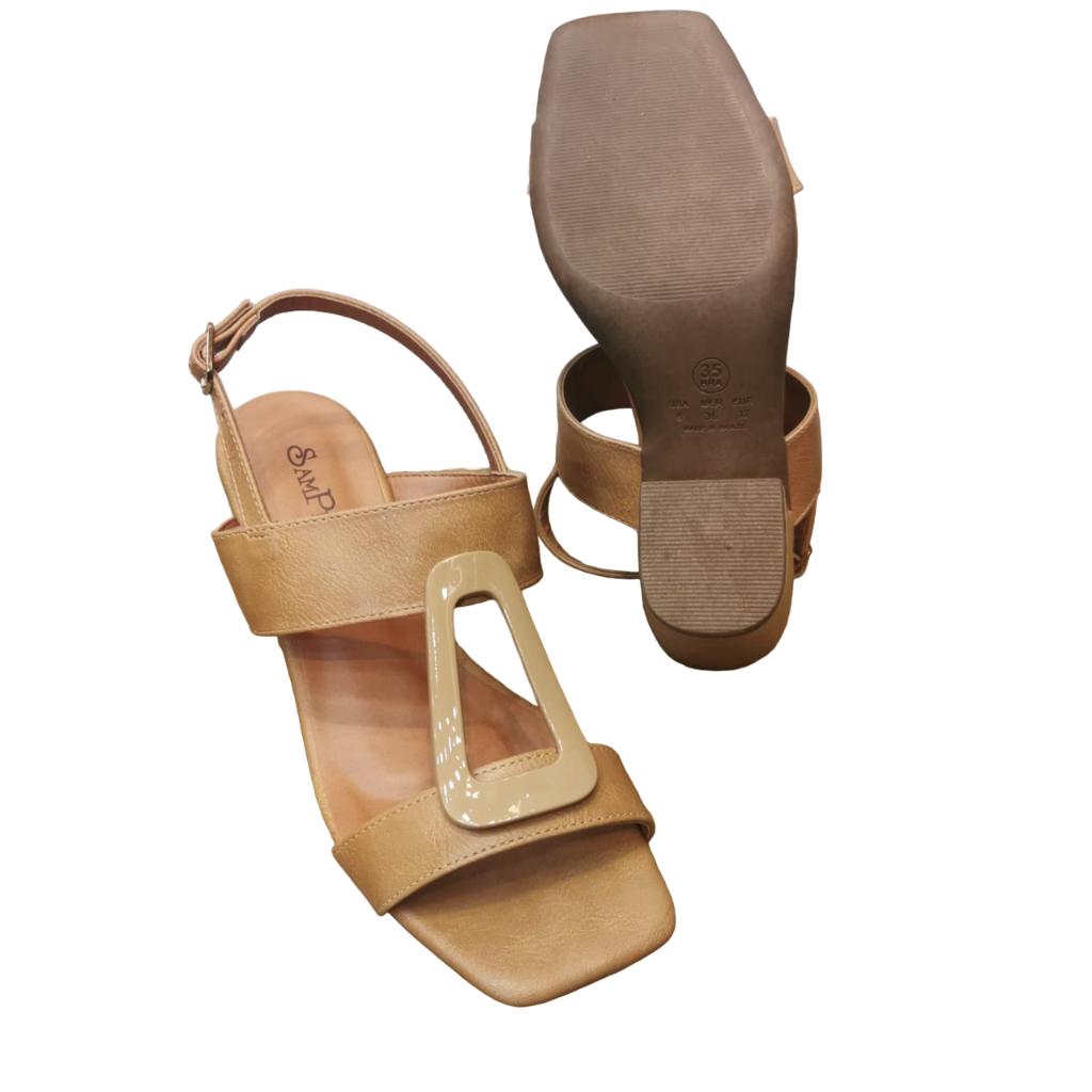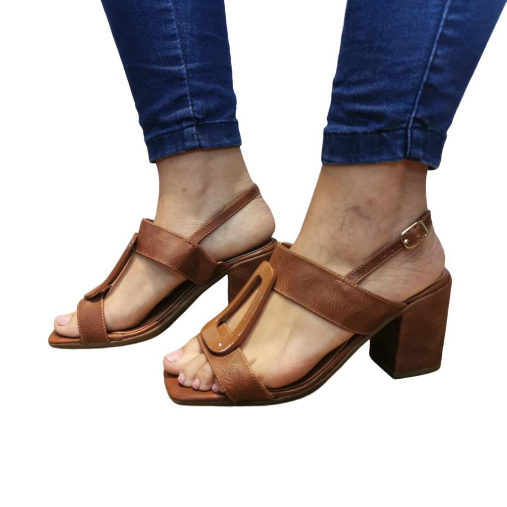 Sandália com salto bloco de 4cm,com duas tiras frontal larga, fechamento com fivela na lateral e aplicação de um triângulo esmaltado no mesmo tom entre as tiras.