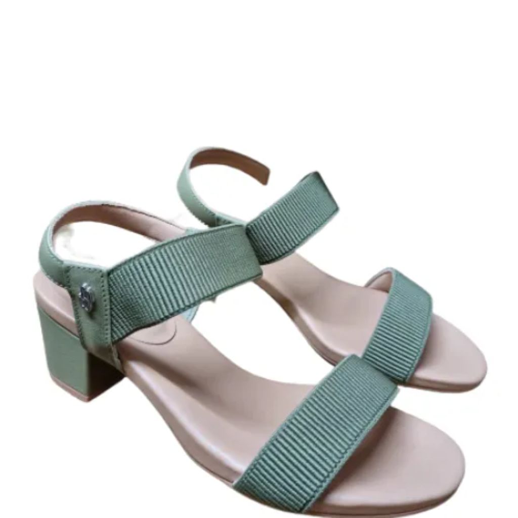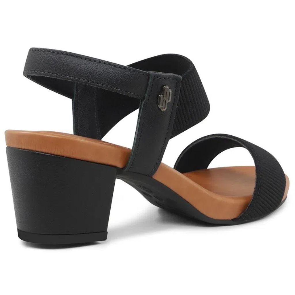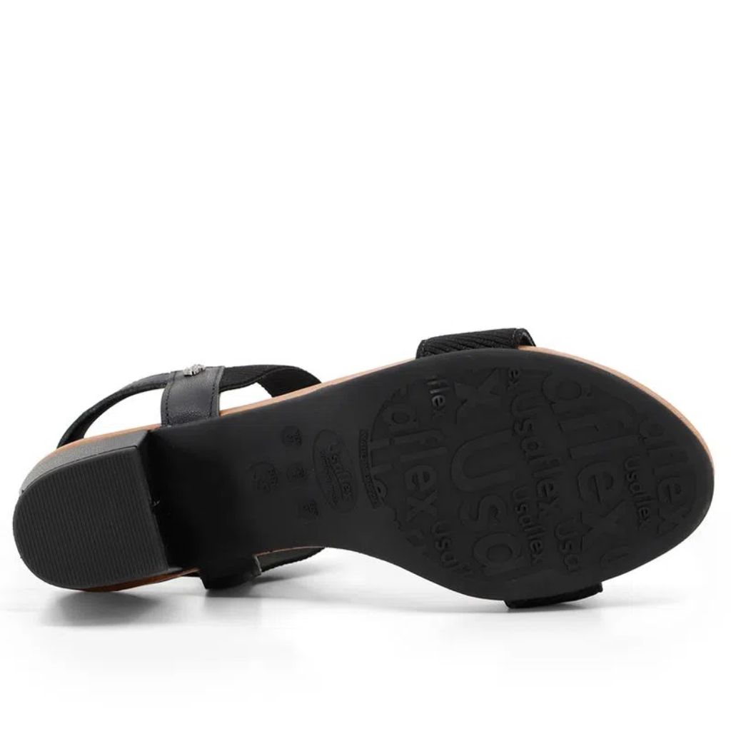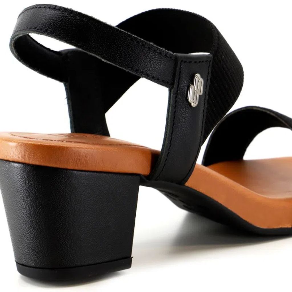 Sandália em couro preto, com elásticos que permitem um calce facilitado e melhor ajuste aos pés.