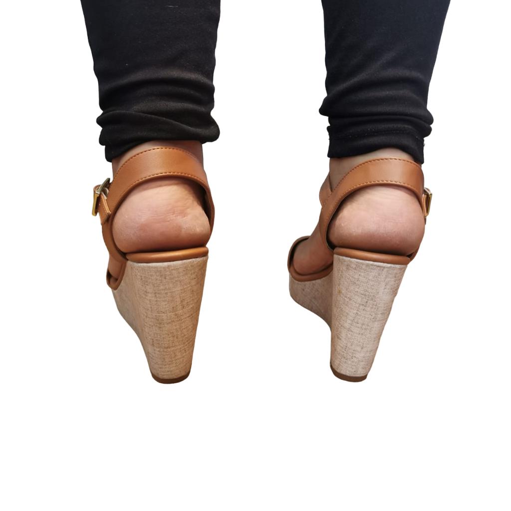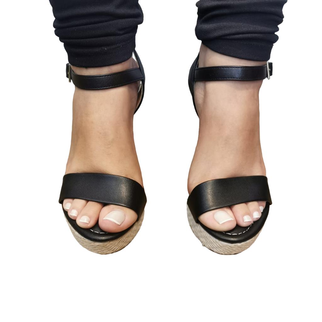 Salto anabela de 11,0 cm de altura e solado em borracha antiderrapante.